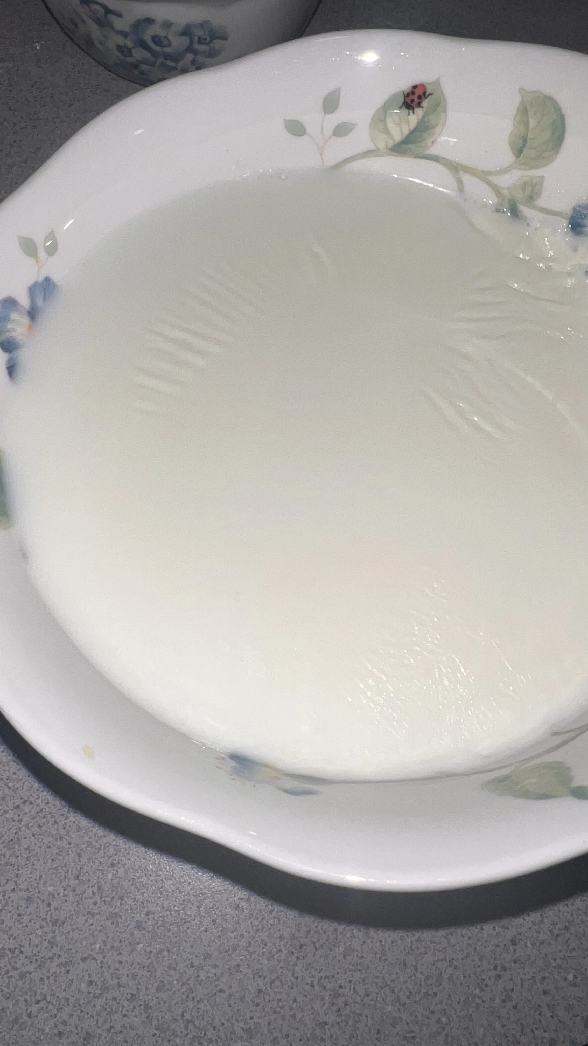 To do this, gently poke a small hole in the milk skin and slowly pour out about six-sevenths of the milk, leaving roughly one-seventh of the milk in the original bowl. This helps keep the milk skin floating intact.